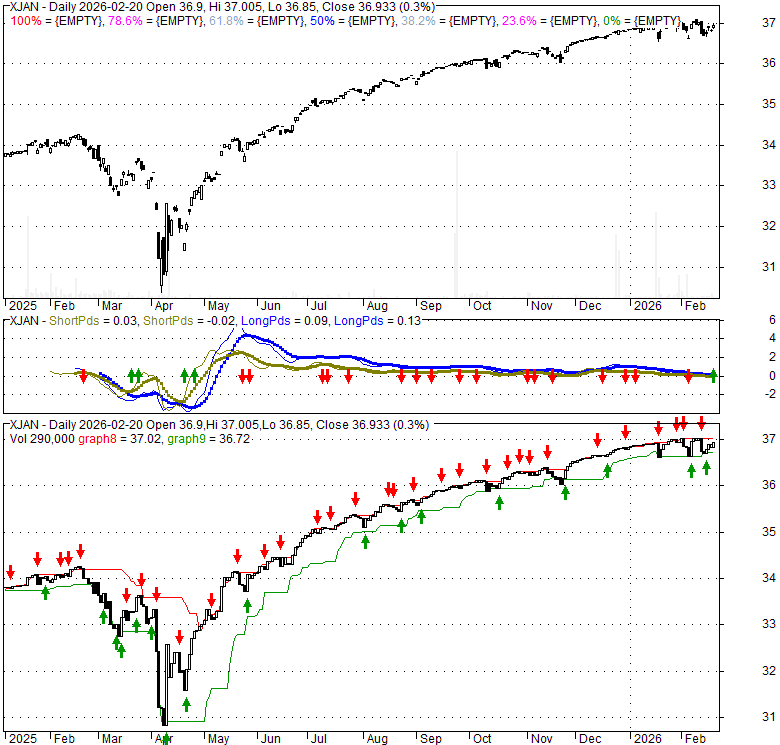 Price has closed above its short-term moving average. Short-term moving average is currently below mid-term; and above long-term moving average. From the relationship between price and moving averages: This stock is NEUTRAL in short-term; and NEUTRAL in mid-long term.[ XJAN ] has closed below upper band by 37.3%. Bollinger Bands are 36.8% wider than normal. The current width of the bands does not suggest anything about the future direction or movement of prices.