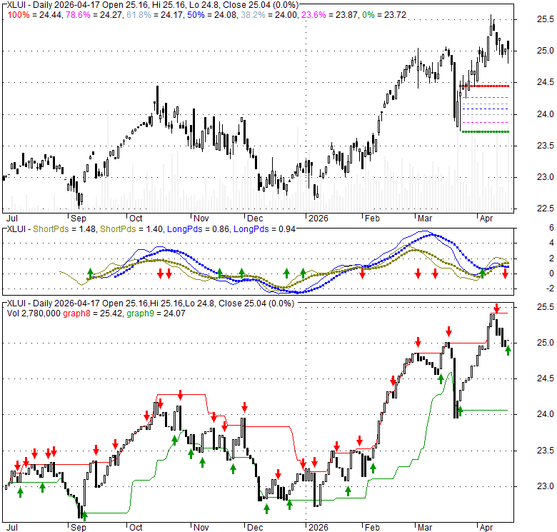 Price has closed below its short-term moving average. Short-term moving average is currently above mid-term; and above long-term moving average. From the relationship between price and moving averages: This stock is NEUTRAL in short-term; and BULLISH in mid-long term.[ XLUI ] has closed below upper band by 44.4%. Bollinger Bands are 1.3% wider than normal. The current width of the bands does not suggest anything about the future direction or movement of prices.