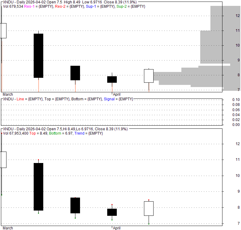 Price has closed below its short-term moving average. Short-term moving average is currently below mid-term; and below long-term moving average. From the relationship between price and moving averages: This stock is NEUTRAL in short-term; and NEUTRAL in mid-long term.[ XNDU ] has closed Bollinger Bands are 0% narrower than normal.