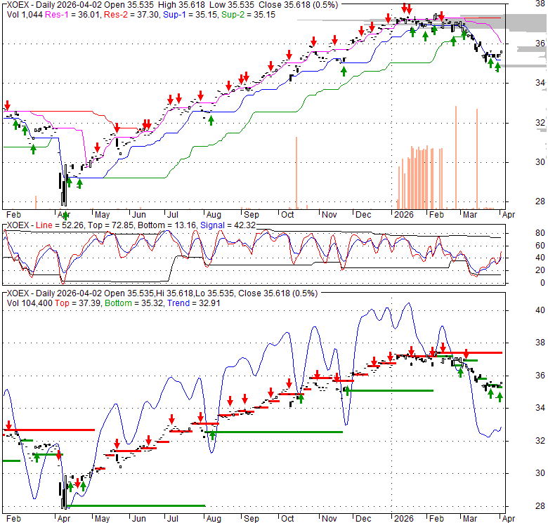 Price has closed above its short-term moving average. Short-term moving average is currently below mid-term; and below long-term moving average. From the relationship between price and moving averages: This stock is NEUTRAL in short-term; and NEUTRAL in mid-long term.[ XOEX ] has closed below upper band by 33.0%. Bollinger Bands are 5% narrower than normal. The current width of the bands does not suggest anything about the future direction or movement of prices.