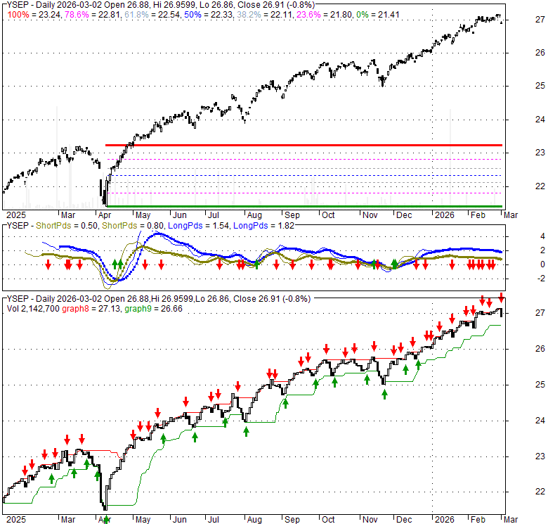YSEP uses flex options in an effort to moderate losses on iShares MSCI EAFE ETF over a one-year period starting each September. The fund uses a slightly different approach than using the MSCI EAFE Index options, what is gained in favorable tax treatment may be lost in higher expense. The fund foregoes some upside return on EFA, in exchange for preventing realization of the first 10% losses. Investors forego upside participation above a certain threshold, which is reset annually. Investors who buy at any other time than the annual reset day may have a very different protection and buffer zone. The issuer publishes effective interim levels daily on its website. The fund must be held to the end of the period to achieve the intended results. The targeted buffers and caps do not include the funds expense ratio. The fund is actively managed.