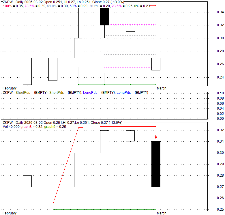 Price has closed below its short-term moving average. Short-term moving average is currently below mid-term; and below long-term moving average. From the relationship between price and moving averages: This stock is NEUTRAL in short-term; and NEUTRAL in mid-long term.[ ZKPW ] has closed Bollinger Bands are 0% narrower than normal.